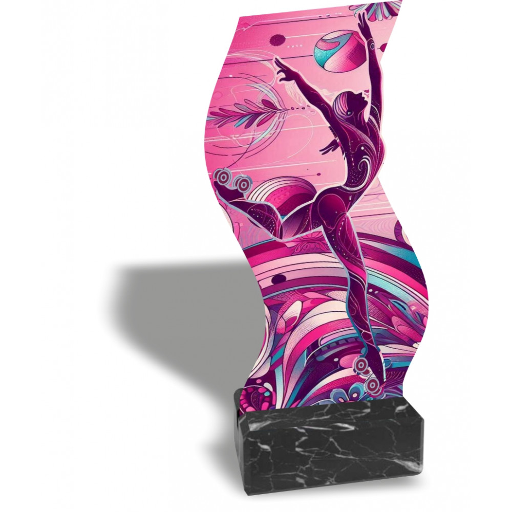 Trophäe aus digital bedrucktem Methacrylat mit einem Kostüm-Motiv.