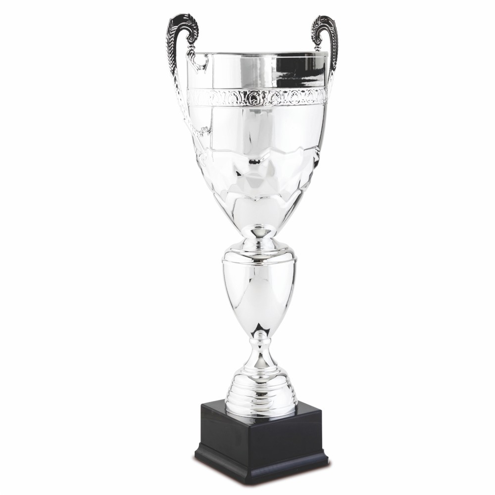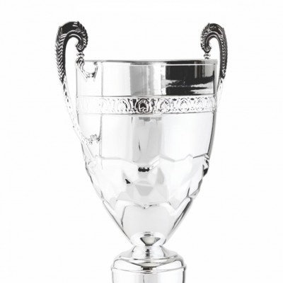 Copa deportiva con asas, cono labrado, color plata. Copa de gran tamaño y calidad.