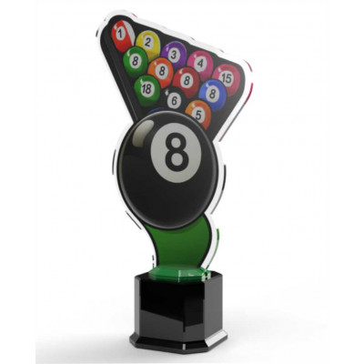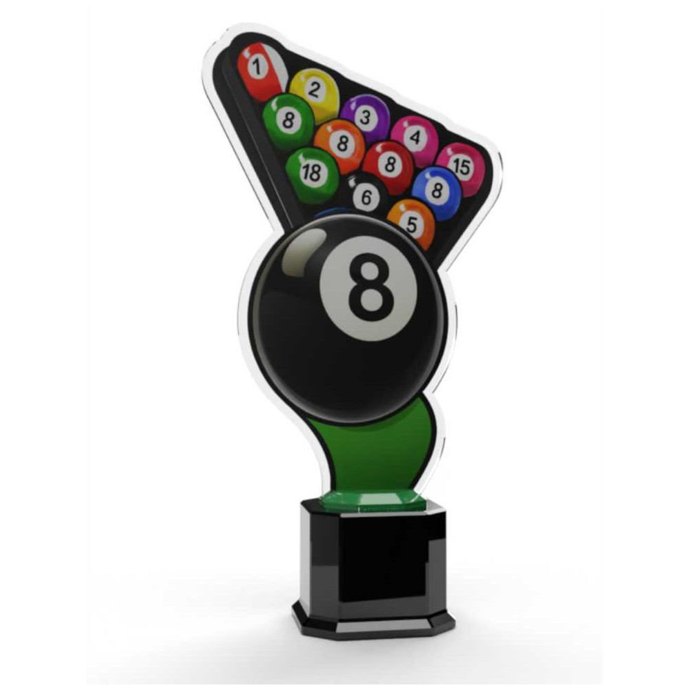 Descubre nuestros trofeos de bola 8 en metacrilato cortado a láser con impresión digital a color. Diseños modernos, personalizables y perfectos para campeonatos de billar. ¡Haz que tu evento destaque!