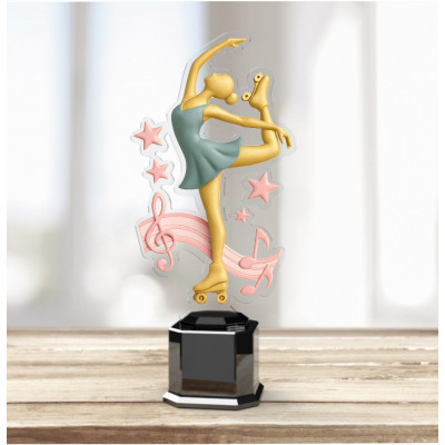 Trofeo fabricado en metacrilato y base negra brillante abs, con forma de corazón y deporte de patinaje artisitico.