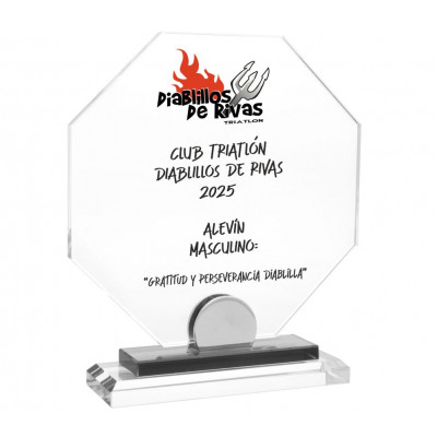 Trofeo cristal con forma de octógono de gran grosor y calidad, todos los bordes están biselados. Este cristal tiene fondo blanco para poder realizar impresiones a color.