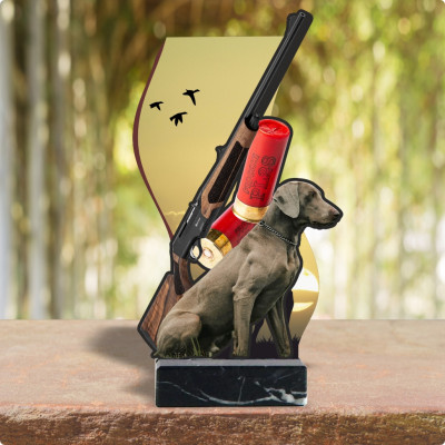 En base de mármol pulido, que aporta elegancia, estabilidad y un toque de distinción. Ideal para concursos de caza, peñas, asociaciones cinegéticas o como regalo conmemorativo, este trofeo destaca por su diseño artístico y su durabilidad.