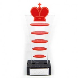 Trofeo di scacchi realizzato in metacrilato a più livelli, ogni livello presenta il disegno di una figura scacchistica. Design e originalità per premiare i migliori scacchisti del campionato. Materiale: metacrilato trasparente (6 mm), metacrilato colorato (3 mm), base in marmo. Incisione inclusa nella piastra metallica