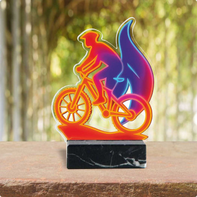 Trofeo realizzato in metacrilato spessore 6mm e base in marmo, con motivi ciclistici. Stampa digitale con la massima qualità.
